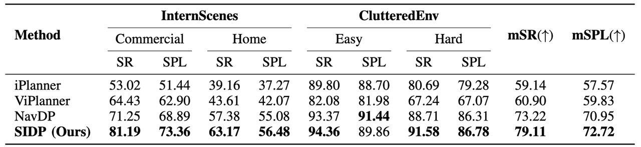 我们把SIDP和目前行业内表现较好的几款模型做了对比测试,包括上海人工智能实验室的NavDP、苏黎世联邦理工学院(ETH Zurich)的ViPlanner和iPlanner,测试结果如下表所示,SIDP在各种场景都表现出了领先的成功率指标,表明我们提出的策略持续自我进化的闭环机制对自主导航产生了显著的作用。