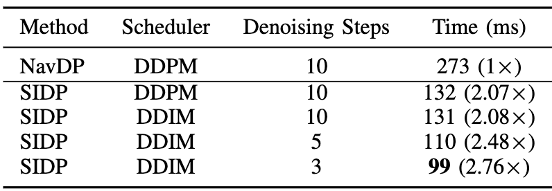 除了走得稳,走得快也很关键。对移动机器人来说,算力和功耗都有限制,导航系统的效率直接决定了它能不能真正落地用起来。而SIDP在训练阶段就已经学会了“少走弯路、直接输出最优路线”,实际运行时不用反复生成大量候选路径筛选,能快速给出可执行的高质量轨迹。哪怕是在嵌入式 、边缘设备上,也能实现低延迟、实时响应的导航,为长时间稳定运行打下基础。