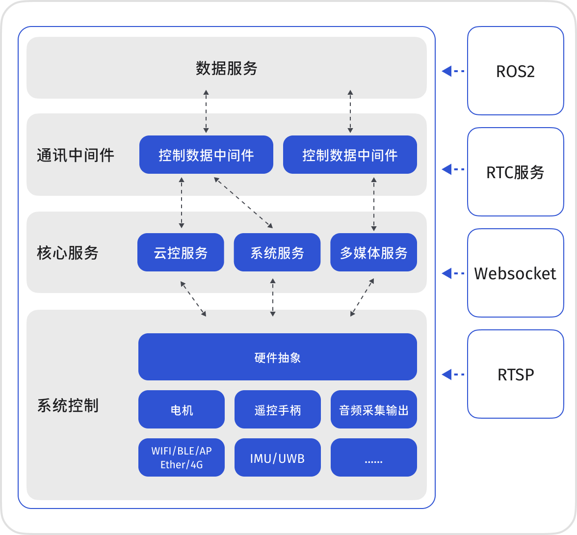 拒绝“接口黑盒”。从底层 FOC 驱动、核心 MPC/WBC 步态源码到上层应用,全逻辑透明集成于 ROS 2 标准架构,支持开发者从任意深度重定义机器人行为。