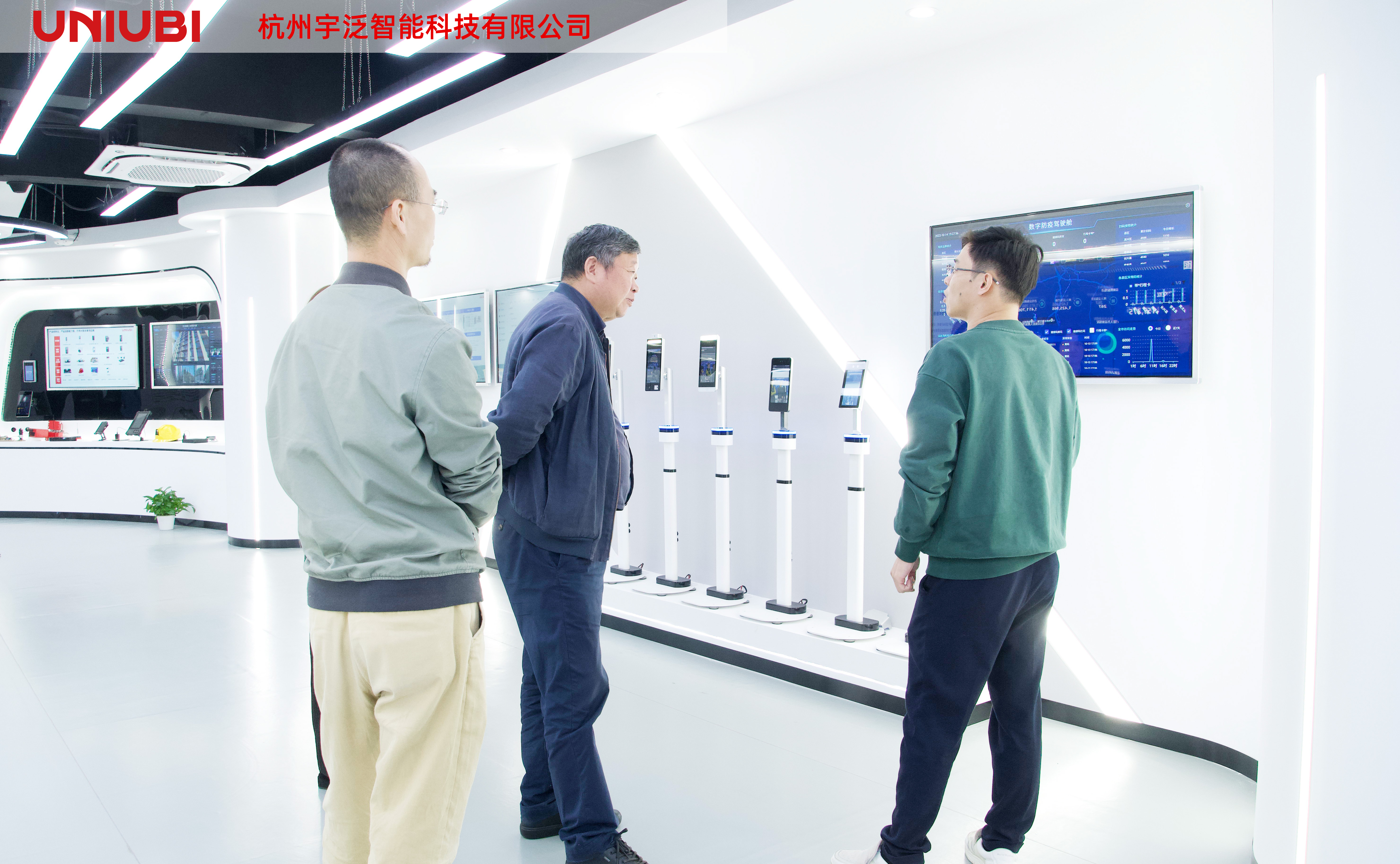 一行人首先参观了公司展厅,听取了公司介绍、发展历程等基本情况。董事长赵弘毅为他们详细介绍了宇泛的智慧汇聚平台,演示了宇泛代表性的智能硬件产品及AIoT平台。