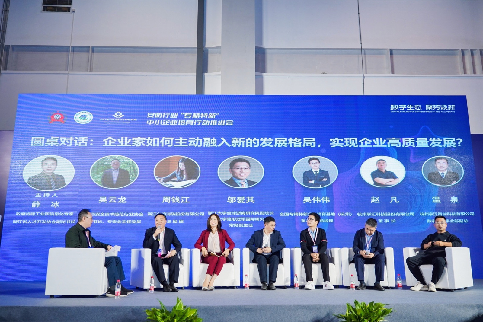以“企业家如何主动融入新发展格局,实现企业高质量发展”为主题的圆桌对话作为压轴环节,汇聚了浙江安防协会副秘书长吴云龙,浙江台谊消防股份有限公司总经理周钱江,全国“专精特新”企业培育杭州基地董事、副总经理吴伟伟,浙江大学全球浙商研究院副院长邬爱其,杭州宇泛智能科技有限公司数字建造事业部副总经理温泉、杭州联汇科技股份有限公司董事长赵凡等六位专家与企业家,为大家呈现了一场精彩的思维碰撞,一场成功的优秀经验分享。 圆桌对话由政府特聘工业和信息化专家、浙江省人才开发协会副秘书长薛冰主持。
