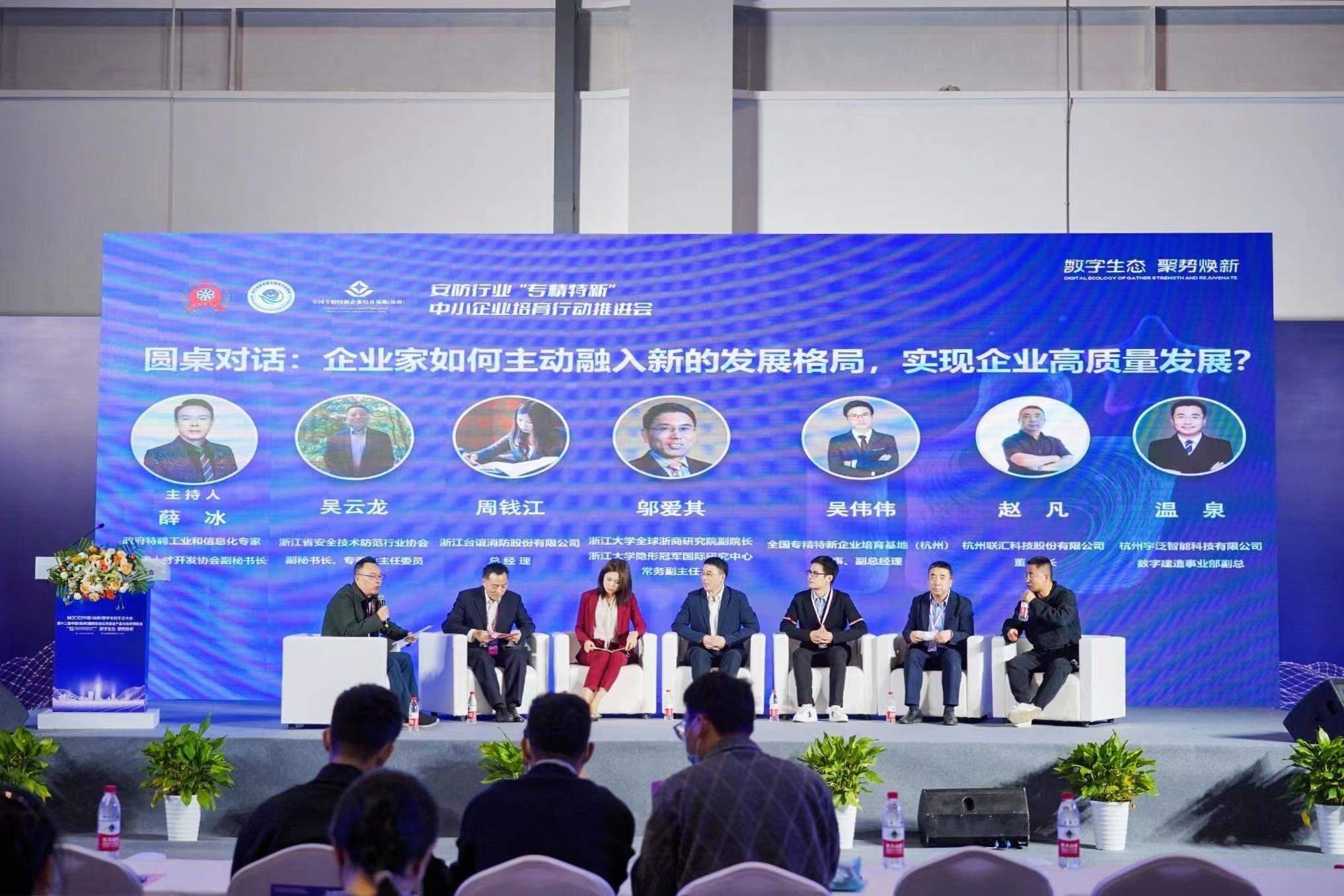 出席本次大会的有中国中小企业发展促进中心地方合作处副处长包锐钻,浙江安防协会秘书长赵永华、全国“专精特新”企业培育基地(杭州)董事、副总经理吴伟伟、浙江大学全球浙商研究院副院长、浙江大学隐形冠军国际研究中心常务副主任邬爱其,浙江安防协会副秘书长、专委会主任委员吴云龙,政府特聘工业和信息化专家、浙江省人才开发协会副秘书长薛冰等领导,以及已获得“专精特新”的企业代表、申请“专精特新”创新型中小企业培育库企业代表等线上线下约350人参会。宇泛作为“专精特新”的企业代表受邀出席,并参与圆桌对话。