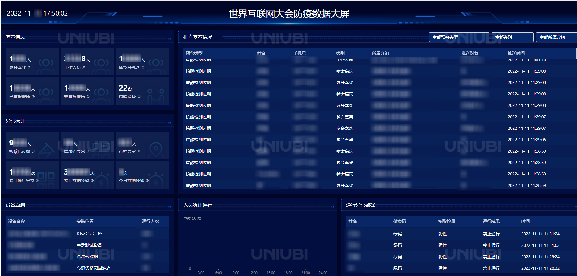 本次互联网大会现场包括观众、嘉宾及工作人员有数万人。为进行更好地管理,本次大会防疫系统与桐行通、大会门禁系统、嘉宾接待系统等相关系统联动,根据防控办的防疫政策,动态管理嘉宾、工作人员和游客的健康信息,包括健康码、核酸、行程等信息。当出现风险时,系统会主动发出预警,通知相关人员进行相关的行为处置,极大提高了筛查效率,有力保证疫情防控工作。