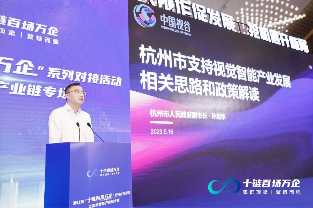 活动现场,孙旭东围绕杭州市支持视觉智能产业发展相关政策进行解读。他表示,目前, 杭州已在“数字安防—视觉智能—智能物联”产业跃升发展的路径上行稳致远 ,并且正在围绕支持龙头企业、窗口园区、科技创新、应用示范、品牌标准、人才支撑、新基建等7方面加紧制定推进视觉智能产业高质量发展的实施意见。未来,杭州将以视觉智能产业高质量发展为主线,以建设“中国视谷”标志性产业名片为重点,加快培育世界级数字产业集群。希望通过5年时间的努力,将杭州建设成为国内领先、全球重要的视觉智能技术创新策源地、高端产业集聚地、成果转化首选地、产业生态最优地,高标准建成“中国视谷”。