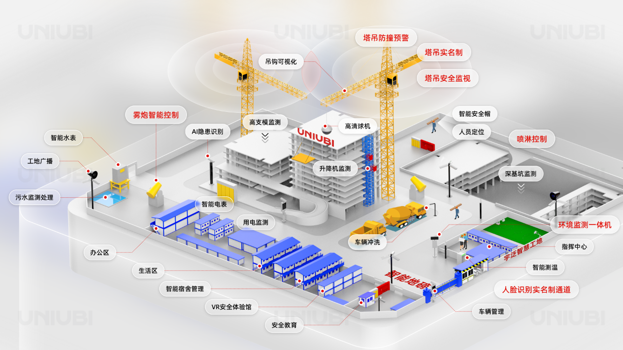 智慧工地领域是宇泛深度参与的智慧城市场景之一,宇泛数智建造综合管理平台是智能物(AIoT)与传统建筑行业管理的深度融合一套系统。平台以宇泛AIoT为数字底座——将工地上使用的各类物联和智能设备进行集中管理,同时承载多个现场管理的业务SaaS应用。平台整合集成了施工现场各类小而精(杂)的专业化系统,提高获取数据的准确性、及时性、真实性和完整性,实现施工过程相关信息的全面感知、互联互通、智能处理和协同工作。