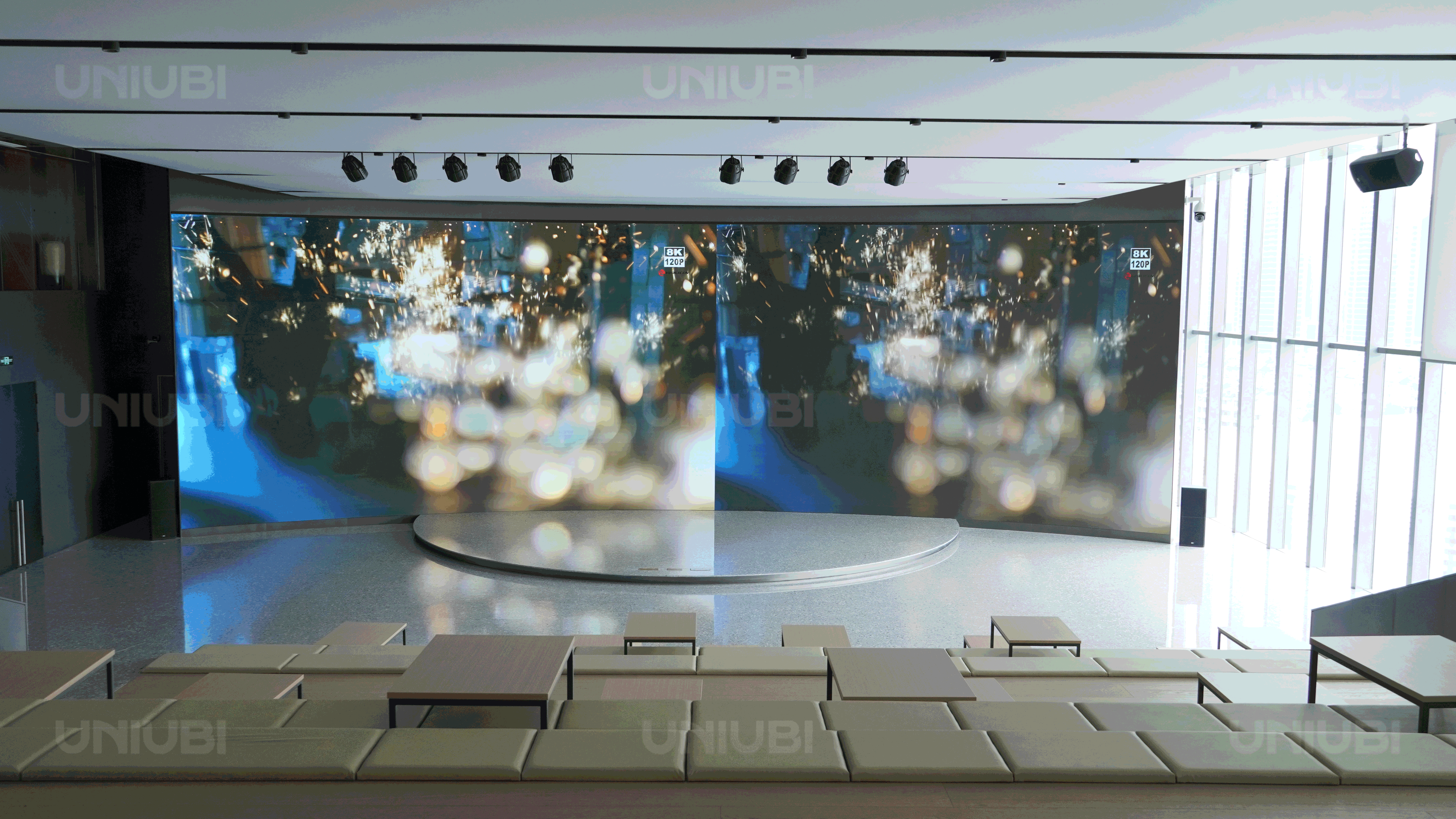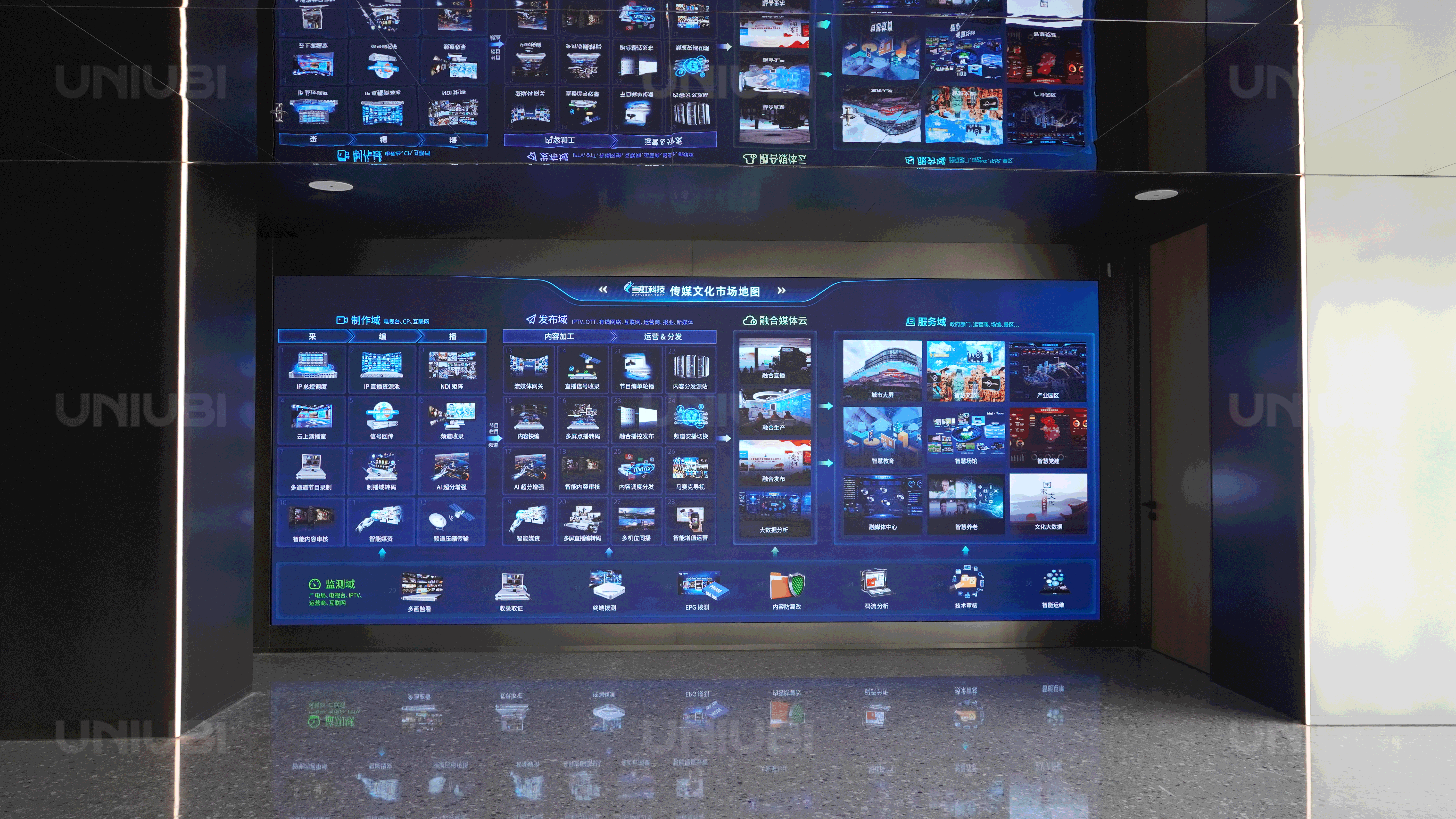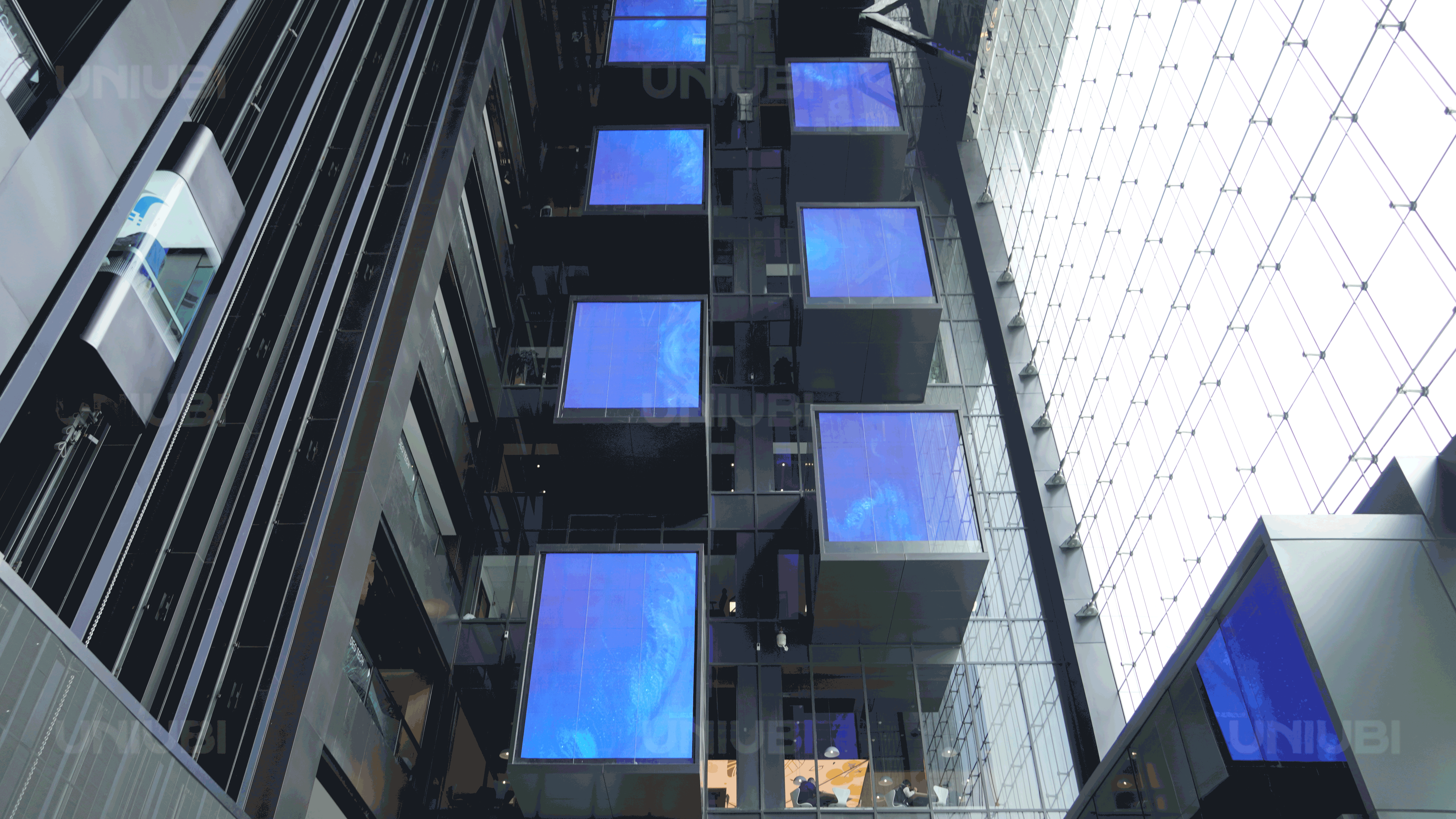 为了提升办公大楼的信息展示和互动体验效果,宇泛为 园区建设了多规格高清大屏显示系统,从入口处的户外3D裸眼屏,到大厅中庭透明屏、电梯厅高亮广告屏、展厅8K超清曲面屏、点触式互动屏,以及多个会议室、报告厅的4K LED屏。