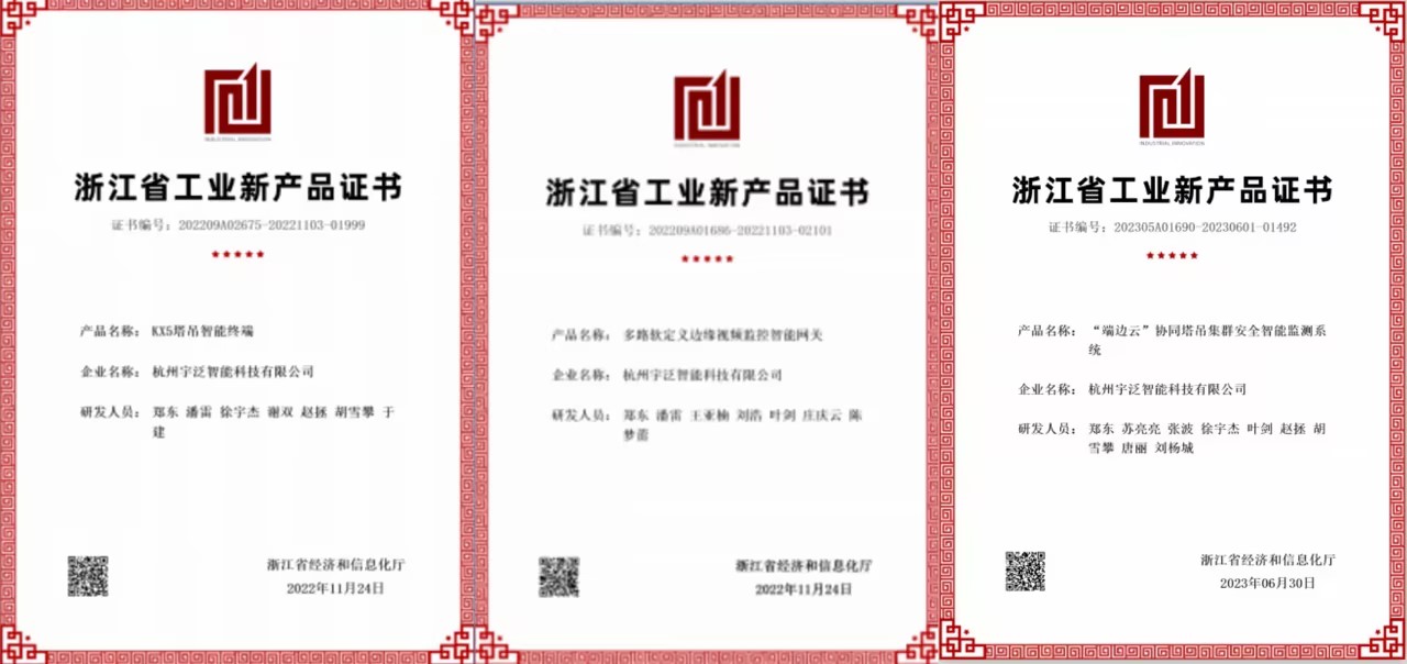 宇泛“端边云”协同塔吊集群安全智能监测系统、KX5塔吊智能终端和多路软定义边缘视频监控智能网关入选浙江省工业新产品;