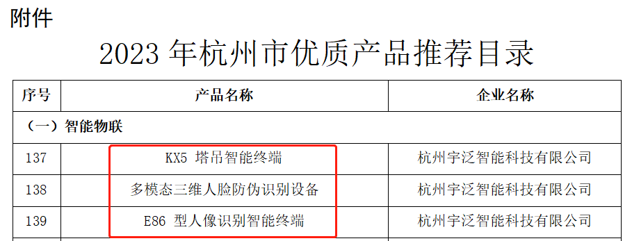 新型生物识别物联感知终端入选《2023年杭州市优质产品推荐目录》;