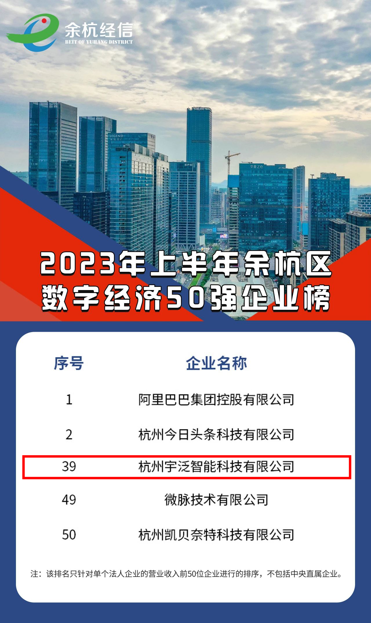 近日,杭州余杭区统计局、数字经济科公布了“2023年上半年余杭区数字经济50强企业榜”, 宇泛荣获杭州政府认可,与阿里巴巴、今日头条等数字经济企业一同上榜!