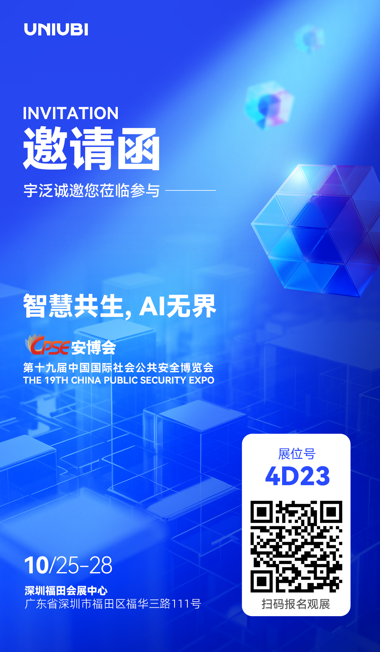 2023第十九届中国国际社会公共安全博览会,将于2023年10月25日至10月28日,在深圳会展中心(福田)举办。宇泛将以“智慧共生 AI无界”为主题,携智慧社区、数智空间、数智建造、海外四大业务展区,闪耀亮相。众多王牌产品和优质新品也将纷纷展出,多角度展现宇泛在智慧城市全场景建设的解决方案能力。