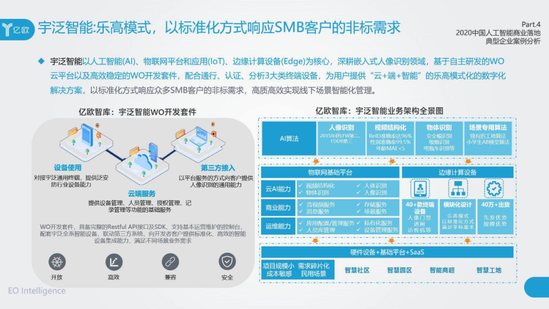 宇泛智能瞄准SMB需求,突出定制化能力,以人工智能(AI)、物联网平台和应用(IoT)、边缘计算设备(Edge)为核心,聚焦算法精进、平台能力提升、设备稳定性提高以及打包方案的落地性强化,针对泛安防领域长尾市场中需求碎片化、项目规模小、基数大、成本敏感等特点,为客户提供从算法、硬件设备到细分场景SaaS的一站式物联网智能视觉解决方案。