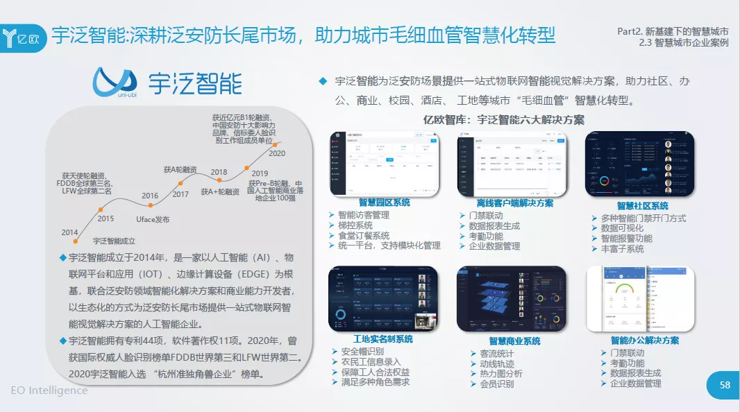 会议着眼于人工智能行业在智慧城市建设中的应用,持续发现和挖掘智慧城市产业发展新动向,知名科创媒体亿欧网在会上发布了《2020中国智慧城市发展研究报告》。宇泛智能因对泛安防行业下沉市场中小企业客户(以下简称“SMB”)需求的准确把握及其超强的落地能力表现入选会议报告典型案例。