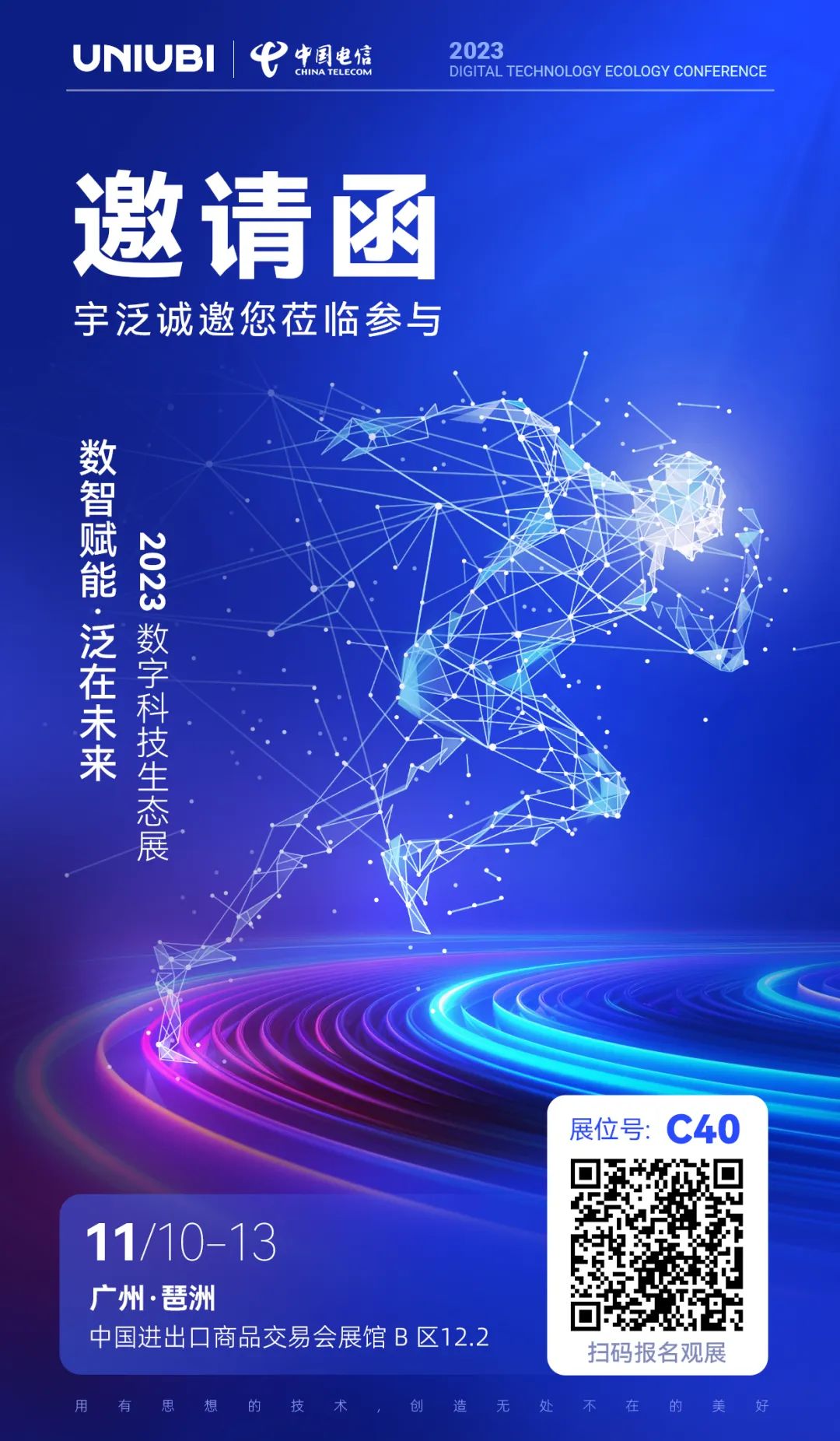 为进一步探索数字科技新边界、铸造数字科技新生态、展望数字经济新愿景, 2023年11月10日-13日,中国电信将携手合作伙伴,在广州琶洲广交会展馆B区举办“2023数字科技生态展”。