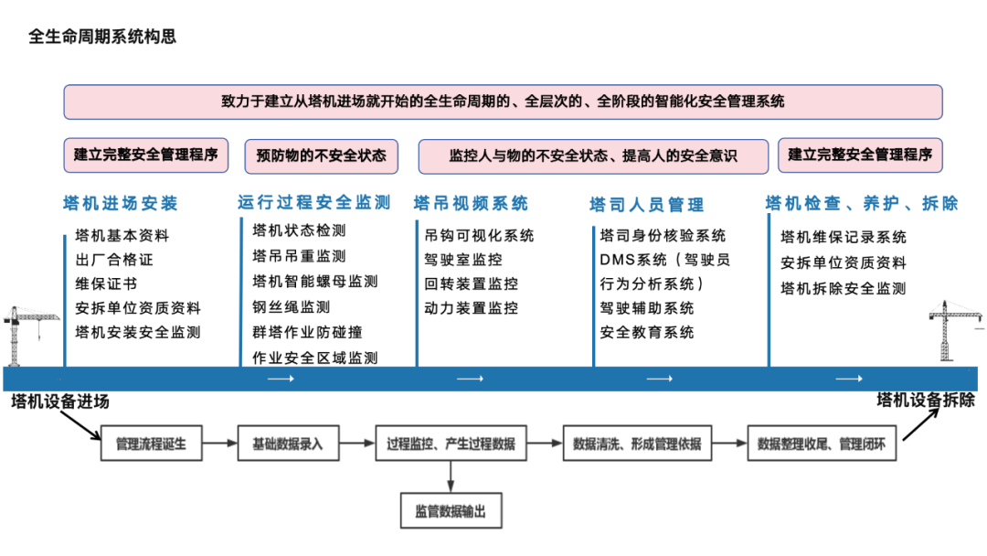 全生命周期塔机管理:全生命周期塔机管理将涉及从塔机进场起始,至塔机退场为止,涵盖塔机的进场、安装、验收、运行、维护以及最终的退场全过程。平台建设在此管理模式的加持下,注重塔机生命周期内的全程监控与数据分析,以确保其安全、高效运行,并通过智能化维护方案延长使用寿命,为工程项目提供全方位的可靠支持。