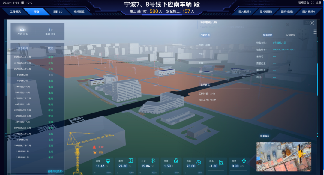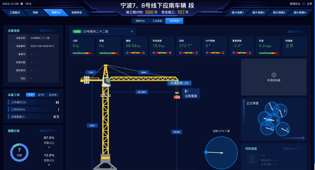 宁波7、8号线下应南车辆段项目经过六个月的建设,塔机监测硬件设备已全部启用,为塔机运行提供完善的安全保障;平台已能够实时采集塔机的运行数据,远程监控设备状态,提供预测性维护建议,强化安全管理,并通过数据分析优化运营效率,为工地提供高效、安全、智能的塔机管理解决方案。