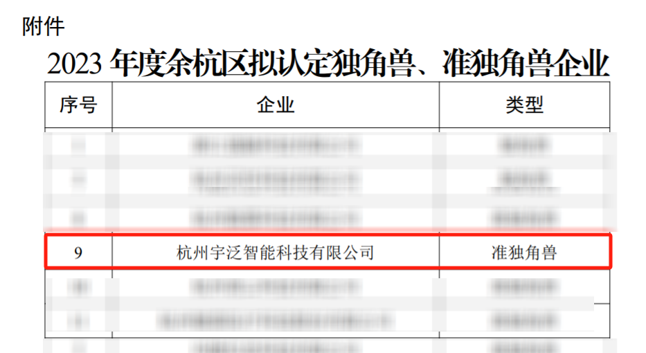 近日,《2023年度余杭区拟认定独角兽、准独角兽企业认定名单》完成公示, 宇泛正式认定为2023年度余杭区“准独角兽”企业 。