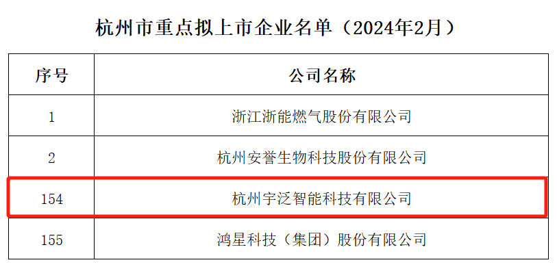 同日, 杭州市金融办更新了《杭州市重点拟上市企业名单》, 宇泛与胡庆余堂、老爸测评等295家企业成功入选。 《杭州市重点拟上市企业名单》在“凤凰行动”计划背景下应运而生,自发布以来,入榜企业长期受到杭州市政府、交易所、金融机构、社会组织等各界的高度关注,是杭州市资本市场后备力量的重要保障。