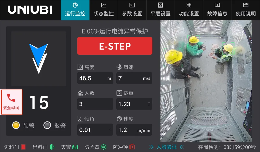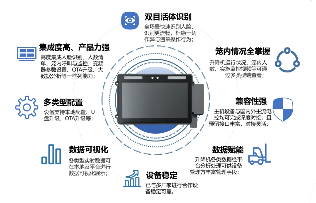 宇泛为大汉科技的升降机产品提供了最新的升降机安全驾驶辅助系统。该系统不仅能够满足传统监管要求,还增加了多种安全功能,如升降机笼内视频监控、驾驶员身份验证、驾驶行为分析、人数清点、人员安全帽佩戴监测以及升降机启停控制等,有效减少了安全事故和违规情况的发生。