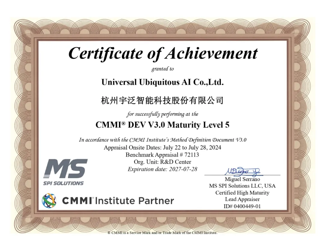 长期以来,宇泛一直高度重视软硬件开发全过程中涉及到的数据、项目、资产库及风险管理,为此建立了一套可视化、规范化的制度流程,以确保项目的高质量落地及信息安全。 早在 2021年,宇泛 便已获得了 CMMI3级认证。此后,公司一直严格遵照CMMI等级规范,不断提升软件质量和开发水平。此次成功获得CMMI5级认证,不仅是 宇泛 在软件研发领域追求卓越、不断创新的成果体现,也是其研发体系迈向标准化、规范化、国际化的重要里程碑。