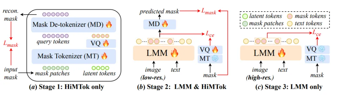 1、掩码表征革新:将图像分割掩码转化为“可理解的语言”。 HiMTok创新性地将图像分割掩码(mask)编码为最多32个具有层次化粒度的一维“掩码令牌”(mask tokens),这些令牌从粗到细逐步描述物体的位置、形状和边缘,突破了传统像素级处理的效率瓶颈。 所有掩码令牌的集合可以看作是一种新的“语言”。
