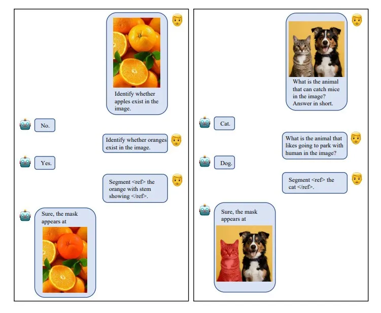 模型的通用视觉理解能力得到了很好的保持,没有因为获得了图像分割能力而被牺牲, 说明我们的方法可以让图像分割能力丝滑嵌入大模型框架中。