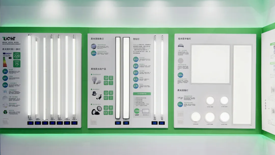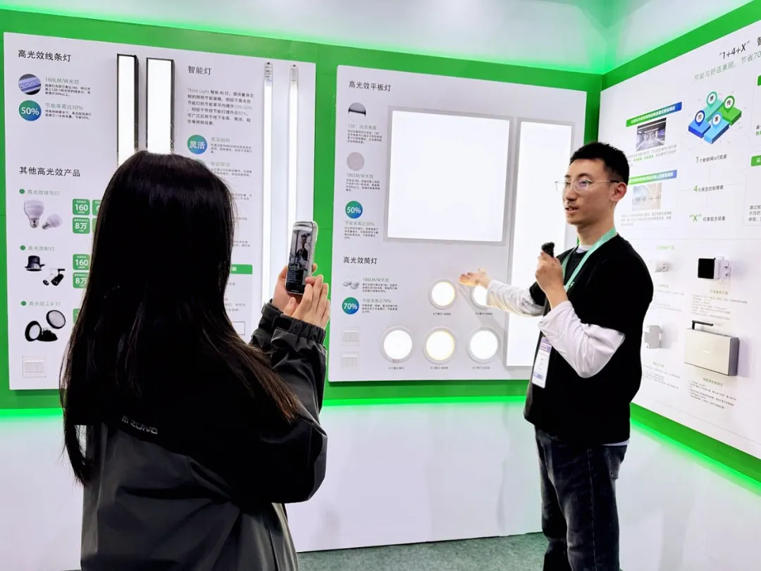 展会现场,展示墙上一个个不同形态的节能灯具引得现场观众驻足参观。不管是灯管、线条灯、平板灯还是筒灯,同等照明需求下,宇泛产品的能耗比传统灯具低了至少50%。有人举起手机拍下数据,感慨“这才是物业降本的真实答案”。