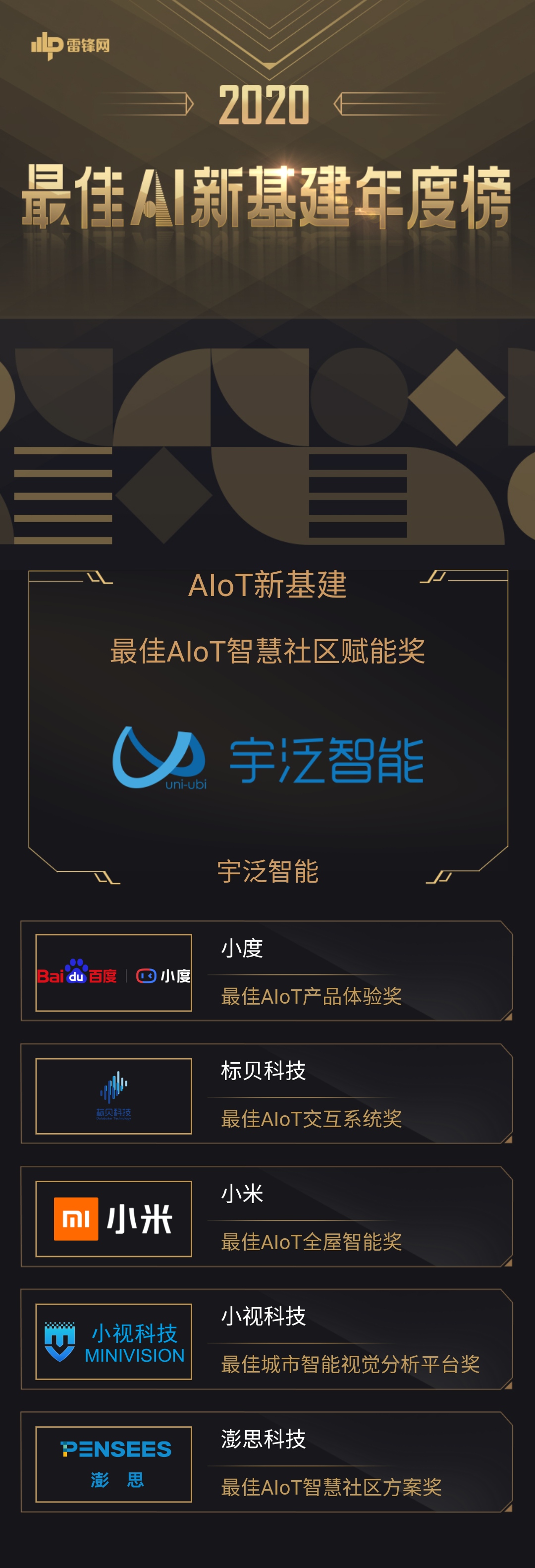 12月3日,雷锋网「2020最佳AI新基建年度榜」揭晓,宇泛智能凭借在智慧社区场景做出的突出贡献,获得“最佳AIoT智慧社区赋能奖”