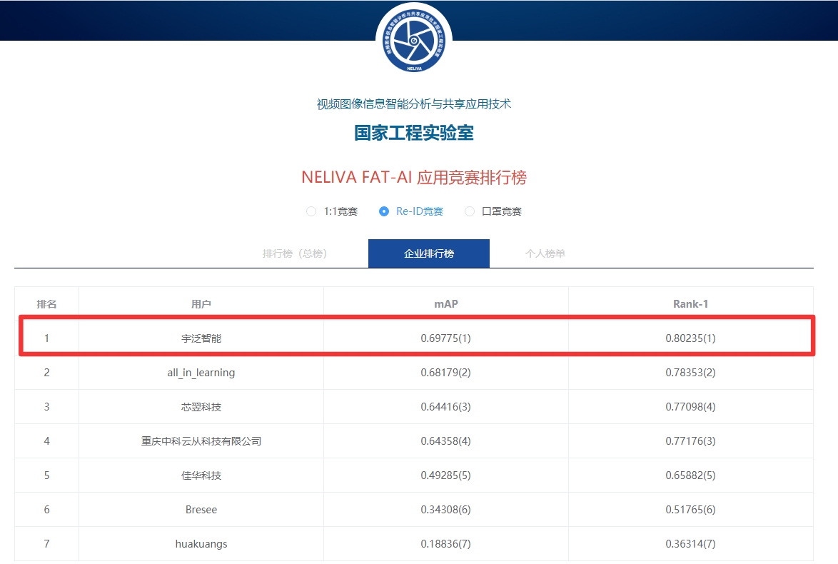 近日,国家工程实验室发布NELIVA FAT-AI应用竞赛最新榜单,宇泛团队在Re-ID竞赛中以Rank-1(首位命中率):0.80235,Map(平均查准率):0.69775的成绩脱颖而出,夺得桂冠,展现出宇泛在社会数智化进程中日益精进的技术实力。