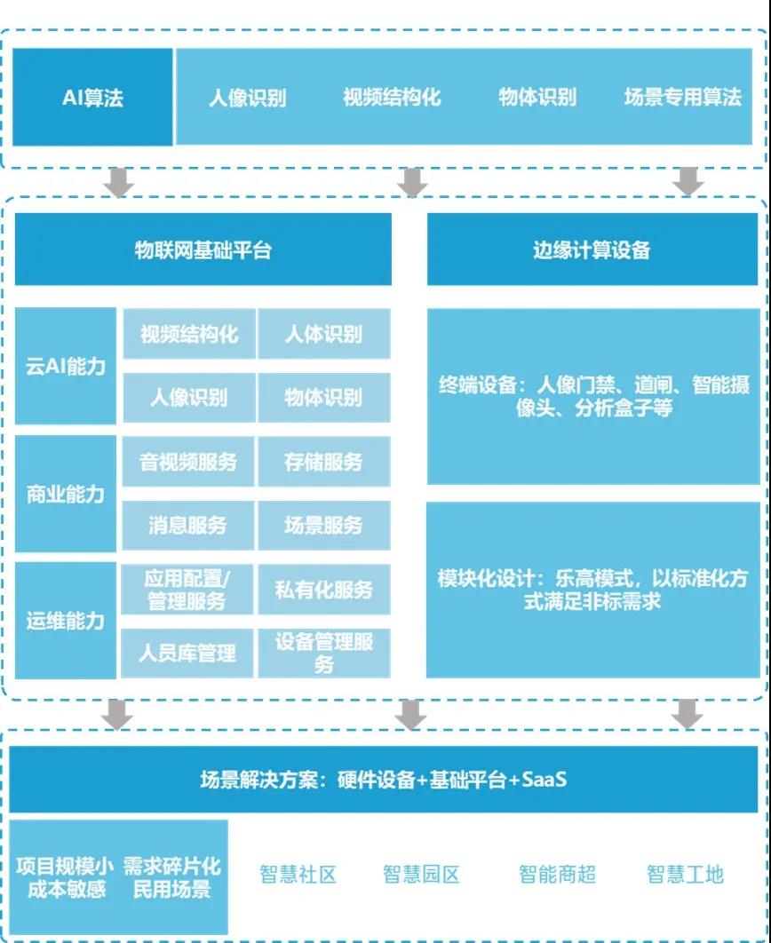 三是物联网能力。光有设备能力和AI能力,无法真正结合场景。我们曾经拿着设备找到物业公司,对方说,“你走吧,我需要的是一套完整的解决方案”。什么是解决方案?包含硬件设备、后台软件,最好能和他们现有的系统打通。在未来万物互联的时代,来源于物联网设备的数据会占据相当比例,物联网的能力很关键。它包含平台和应用的能力,一方面实现设备的整体连接,另一方面为客户提供拓展应用。