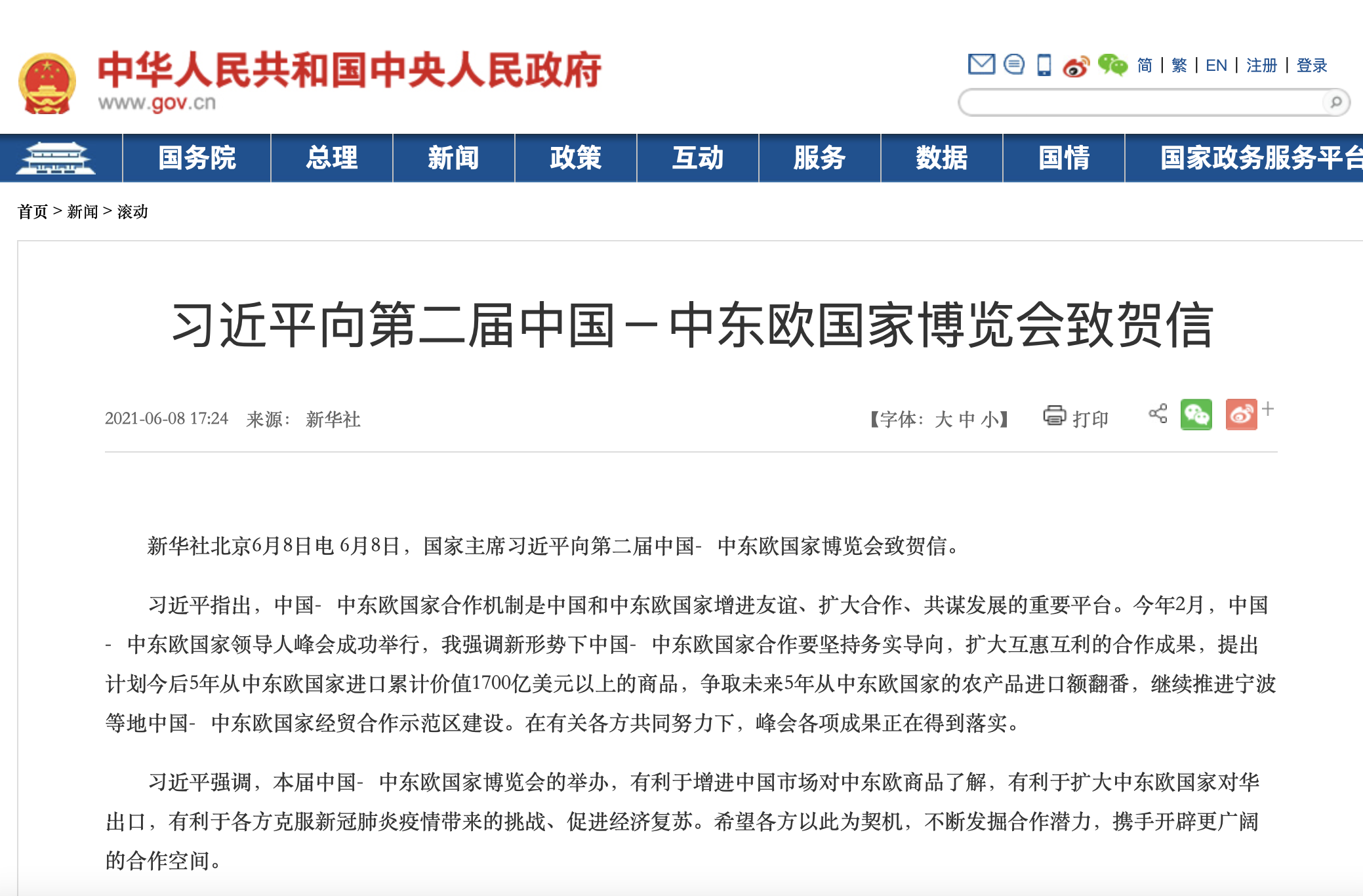 国家主席习近平向第二届中国—中东欧国家博览会致贺信。习近平指出,中国—中东欧国家合作机制是中国和中东欧国家增进友谊、扩大合作、共谋发展的重要平台。本届中国—中东欧国家博览会的举办,有利于增进中国市场对中东欧商品了解,有利于扩大中东欧国家对华出口,有利于各方克服新冠肺炎疫情带来的挑战、促进经济复苏。
