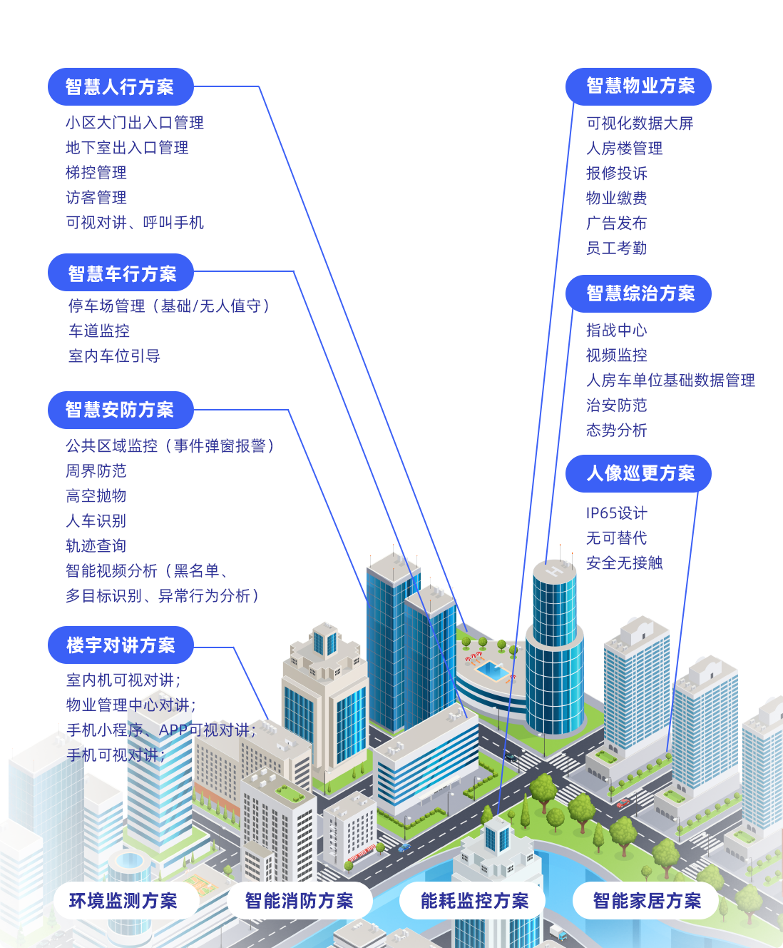 宇泛全生态智慧社区解决方案包含智慧人行、智慧车行、智慧物业、楼宇对讲、智慧安防、人像巡更、智慧综治、智慧消防、智能家居、环境监测子系统等子系统,覆盖社区场景中的全场景应用,满足社区管理的多样化需求,让智能生活触手可得。