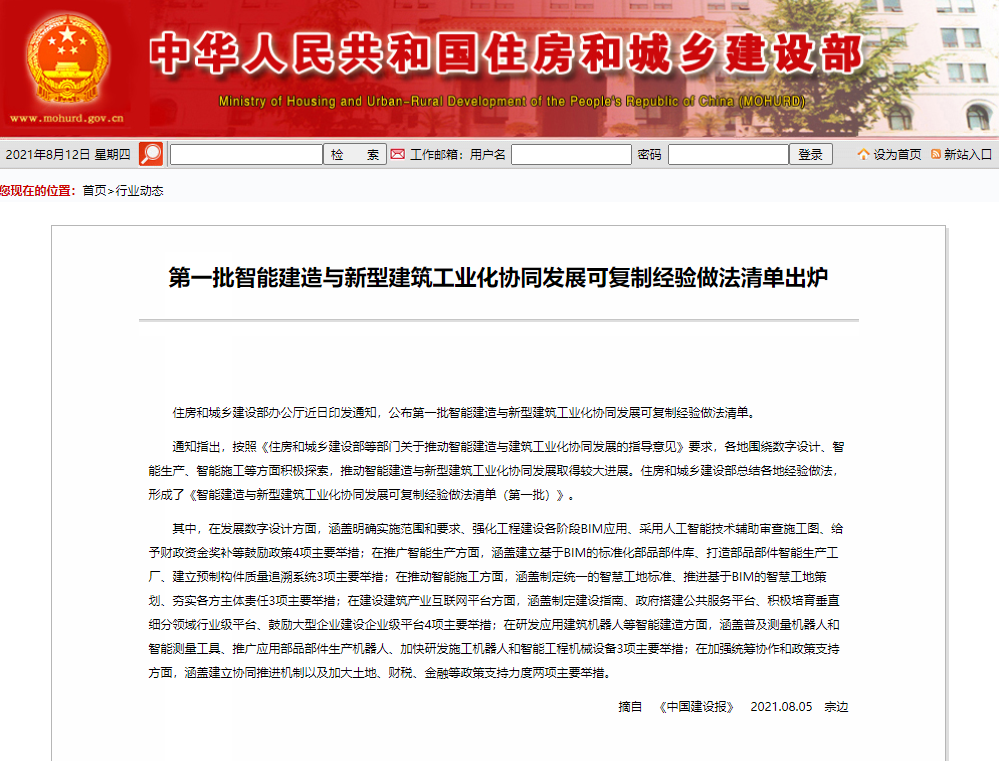 经过长时间以来各地在智能施工方面的积极探索,成功推动了智能建造的高质量发展。近日,住房和城乡建设部总结了各地的经验做法,推出第一批智能建造与新型建筑工业化协同发展可复制经验做法清单(下文简称《清单》),供各地参考学习,以期加快建筑业转型升级的步伐。
