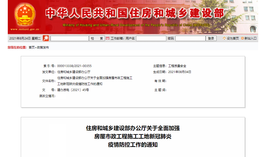 为全面加强工地疫情防控工作,住建部于本月发布《关于全面加强房屋市政工程施工工地新冠肺炎疫情防控工作的通知》,再次强调推进贯彻落实各项政策要求及疫情防控常态化措施。
