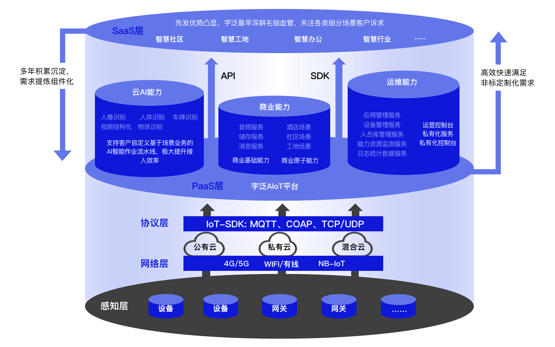 2017年宇泛推出了自研AIoT平台,以AI和IoT两大核心能力为基础构建业务生态。经过四年的迭代、升级、优化,持续以PaaS服务及配套的SDK、SaaS和解决方案等形式,为生态合作伙伴提供稳定高效完备的泛安防行业场景化智能设备高效集成能力、云AI服务能力(以标准的Restful API等形式提供云端AI算法能力)、IoT服务能力(物联网核心能力,融合设备通信、操控、升级等服务)、商业服务能力(提供完整的开发生态基础架构和商业化应用服务能力)、系统集成方案和服务(融合宇泛商业服务能力与智能设备集成的系统方案),赋能智慧工地、智慧社区、智慧办公、智慧酒店等行业,极大地提升了客户落地智能化应用的效率,降低了其项目整体建设成本。