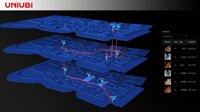 宇泛自研REID算法,通过人像识别加跨相机身形监测,能多维度识别行人特征,生成实时动线轨迹,以图搜人。