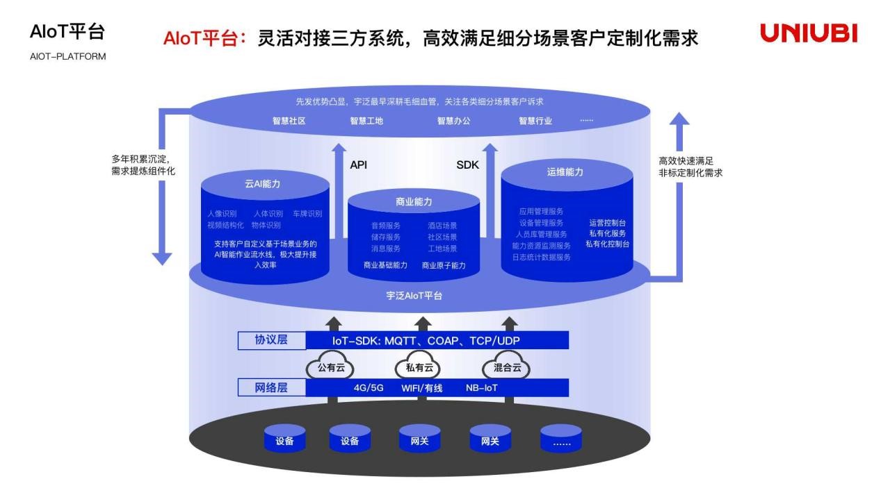 经过四年的迭代、升级和优化,宇泛AIoT平台持续以PaaS服务及配套的SDK、SaaS和解决方案等形式,为生态合作伙伴提供稳定、高效、完备的泛安防行业场景化智能设备高效集成能力、云AI服务能力、IoT服务能力、商业服务能力、系统集成方案和服务,赋能数智建造、智慧社区、智慧办公、智慧酒店等行业,极大地提升了客户落地智能化应用的效率,降低项目整体建设成本。