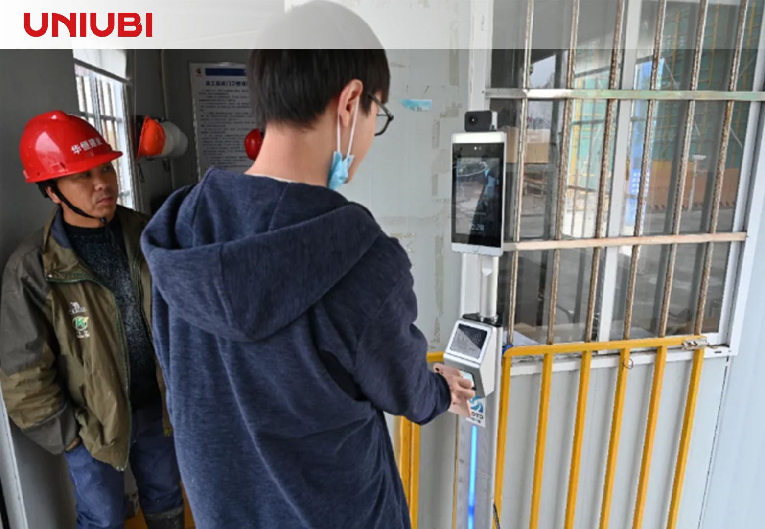 这就是宇泛人像识别终端,目前该设备已经正式投入到杭州湾在建项目中。这台设备将人工智能算法和红外测温技术相结合,工人只需站在这台终端设备前,就能同时完成身份识别、体温测量、健康码状态核验等流程,搭配宇泛自研的AIoT平台,即使在工地无人值守的情况下也能完成人员核验筛查工作。