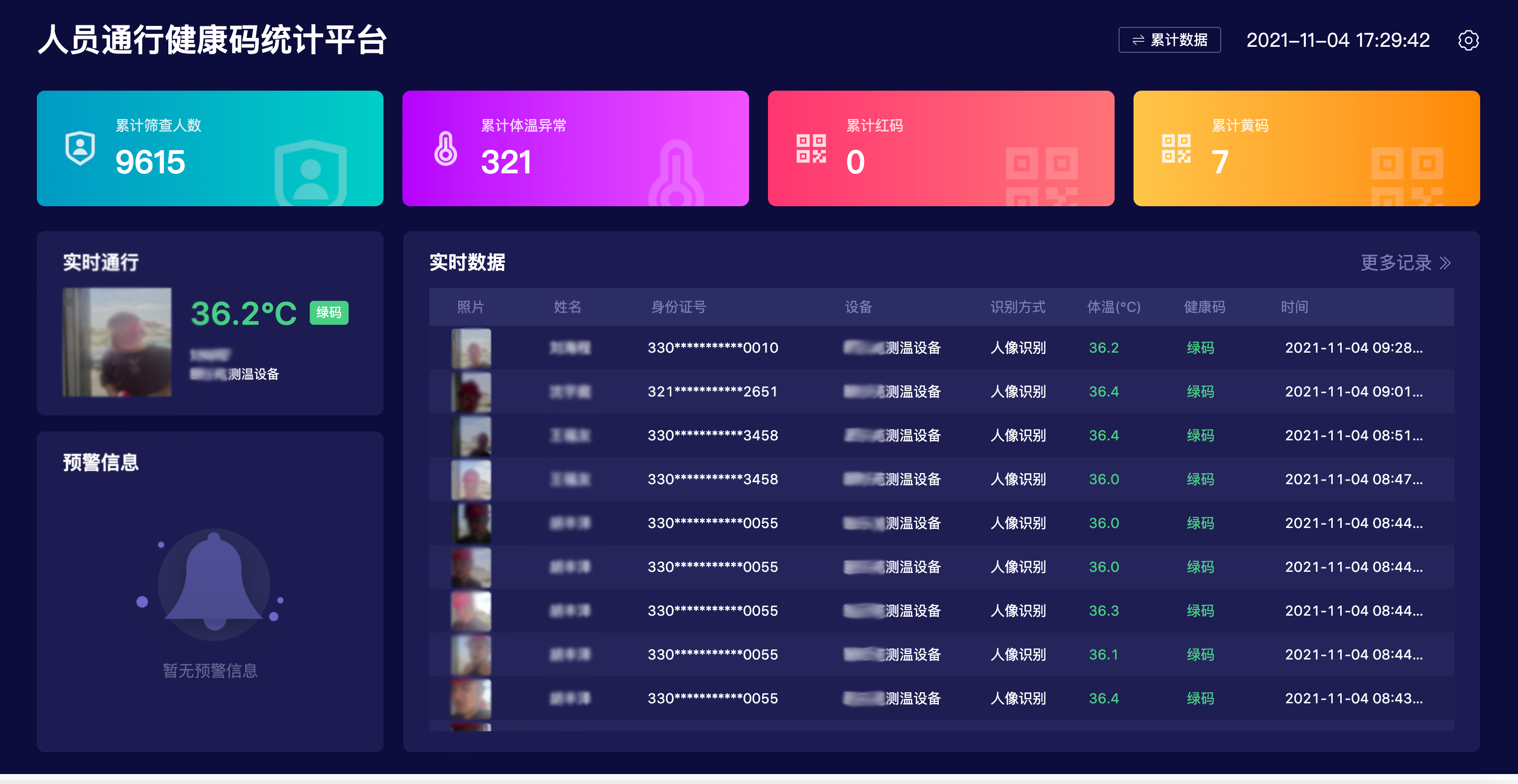 “这台人像识别终端支持三种检测方式,工地新进的员工都会在系统后台录入自己的各类信息并及时更新,简单的人像识别就可以从云端调取人员的健康码信息状况,外来人员也可以通过身份证识别或者扫描国家政务服务平台的防疫健康码获取检测的相关信息,免除了传统繁琐的人工登记测温。”前湾控股集团安全生产部相关负责人表示,“设备测量的体温信息和实名制人员信息是相关联的,识别的同时体温数据也会实时上传,如果发现体温异常情况,后台就会跳出提示预警,我们监管人员会第一时间对存在风险的人员采取措施,很大程度提升了管理效率。”