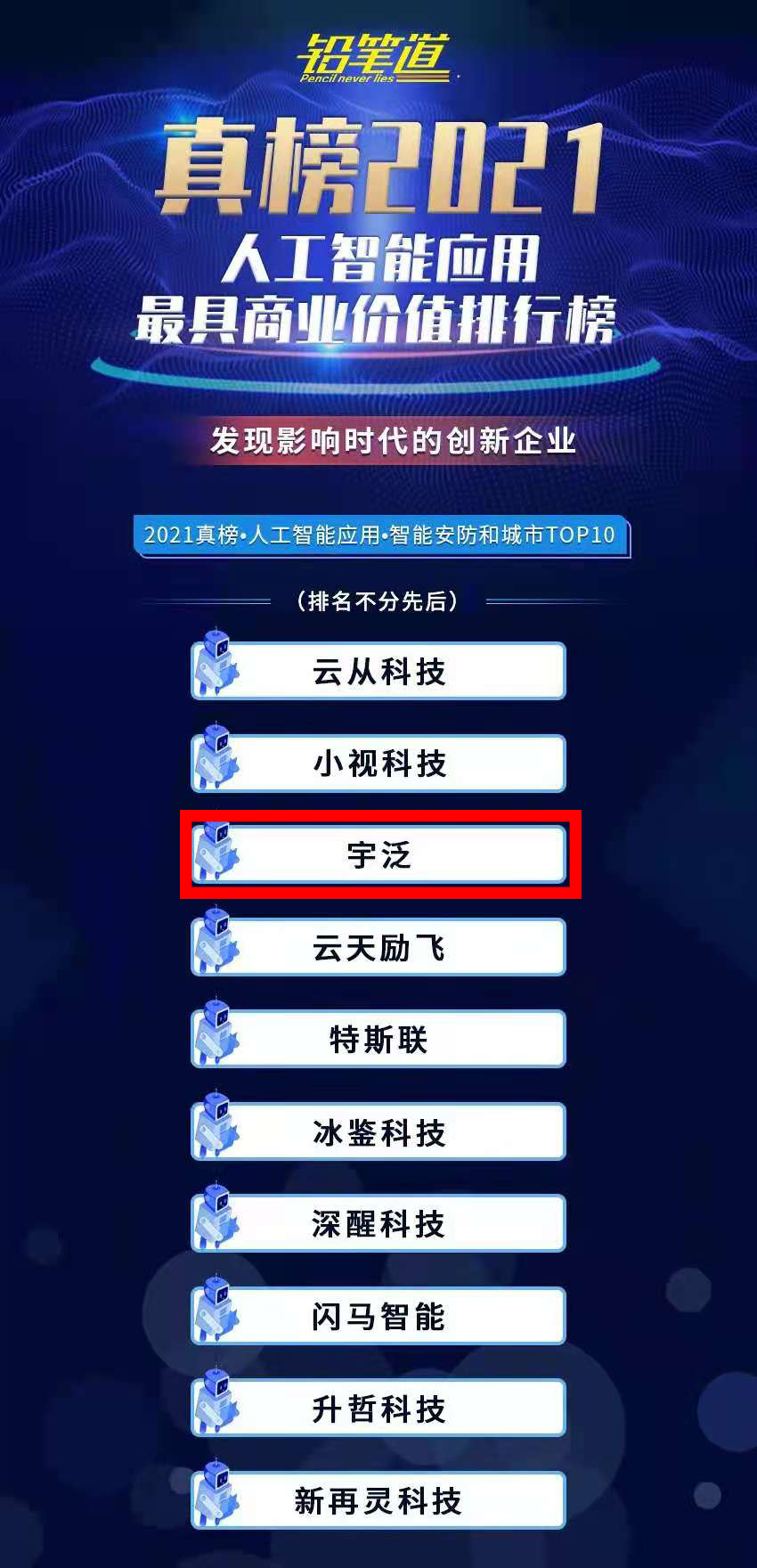 宇泛成功入选“2021人工智能应用最具商业价值排行榜·智能安防与城市TOP10”